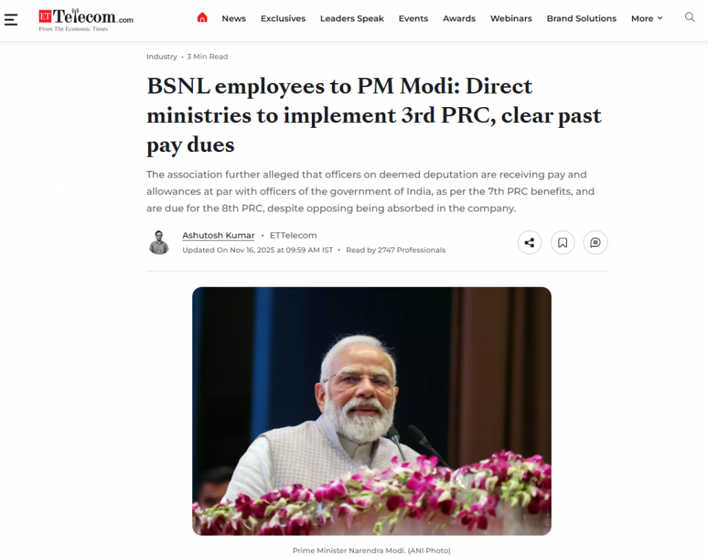 The Economic Times has published a detailed news report on the joint representation submitted by the BMS-affiliated unions and associations of BSNL to Hon’ble Prime Minister Shri Narendra Modi. The article highlights our collective request for implementation of the 3rd PRC in BSNL and clearance of the pending residual benefits of the 2nd PRC.